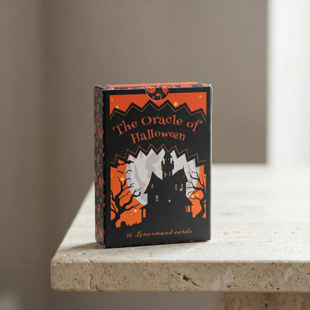 Halloween Lenormand is a 36-card collectible set designed as the perfect companion to the Halloween Tarot. It keeps the same bold seasonal identity — deep matte-black visuals, glowing orange energy, and that cozy “festival + eerie” mood — but in a compact poker-size format made for fast layouts and daily pulls.