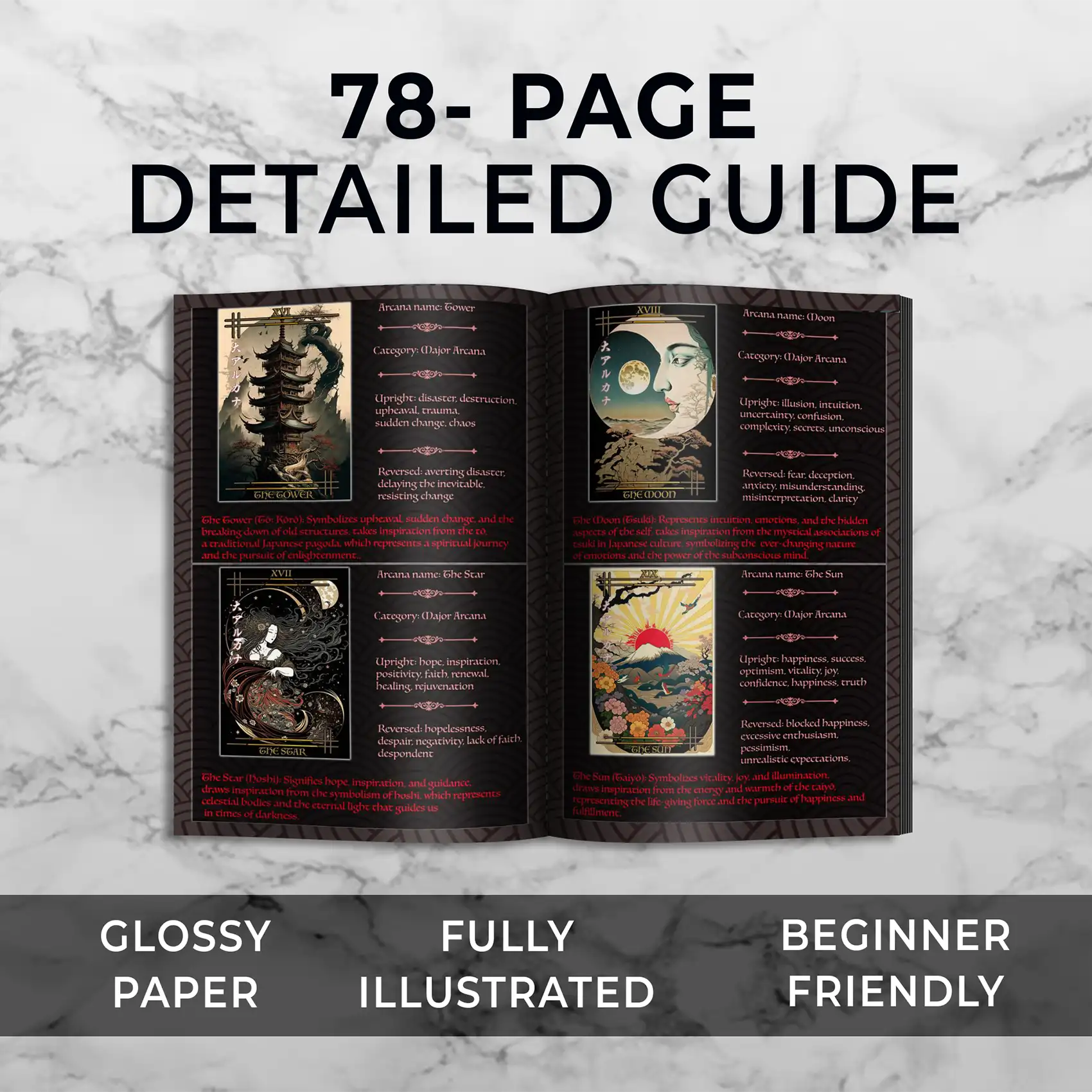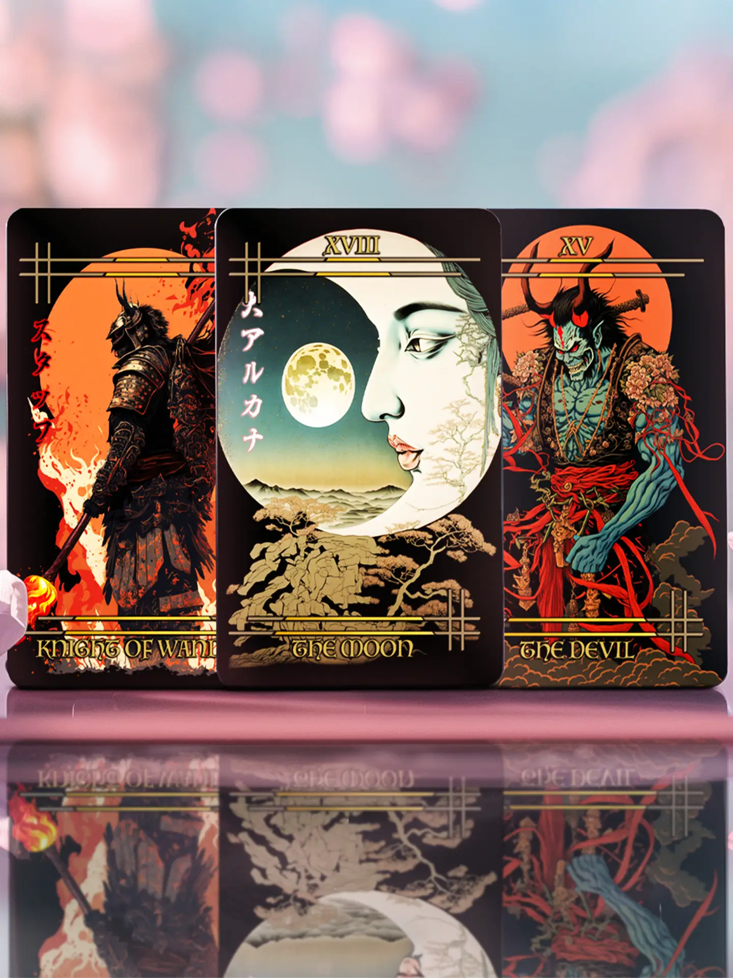 The artwork draws deeply from Japanese aesthetics and folklore. You will find references to ukiyo-e line work, seasonal symbols, Shinto and Buddhist imagery, yokai, and classic motifs like waves and koi. Color is restrained and purposeful, inviting a calm focus. The result is a deck that feels disciplined, elegant, and quietly powerful.